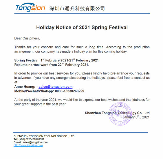 新闻摘要:Holiday Notice of 2021 Spring Festival,China leading provider of Fiber Media Converter and Fiber Optic Equipment, Shenzhen Tongsion Technology Co., LTD is Professional Optical Network Solution Supplier in China.